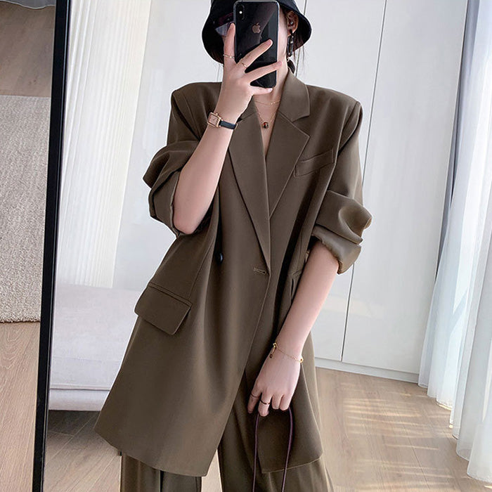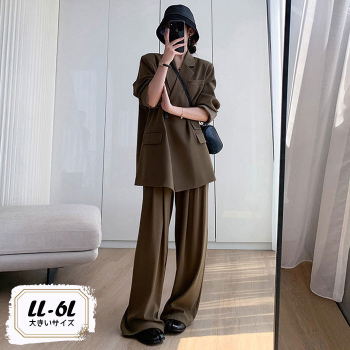 さらっと羽織れるジャケットと、落ち感のあるワイドパンツがセットになったプラスサイズ仕様。