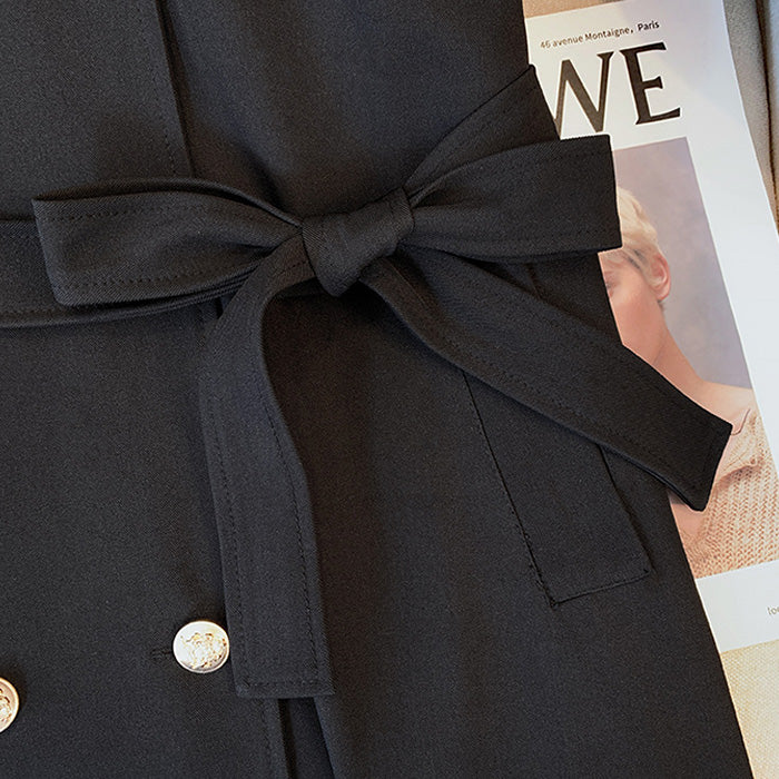 ウエストのリボンベルトでシルエットを自由に調整でき、前を開けても閉じても美しいシルエットをキープ。
