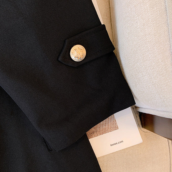 ゴールドのボタンが上品に輝き、大人の女性らしさをさりげなくプラス。