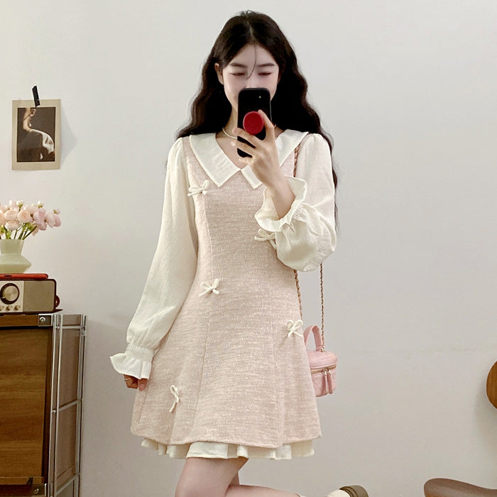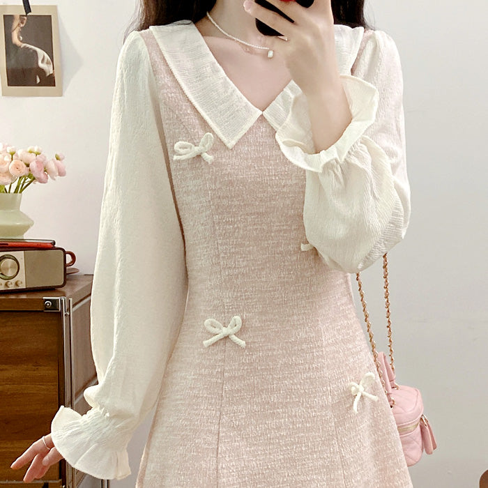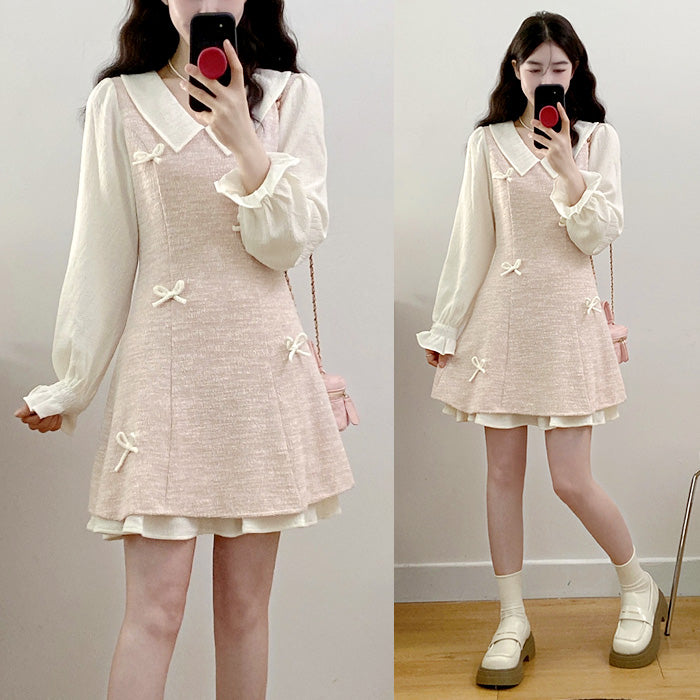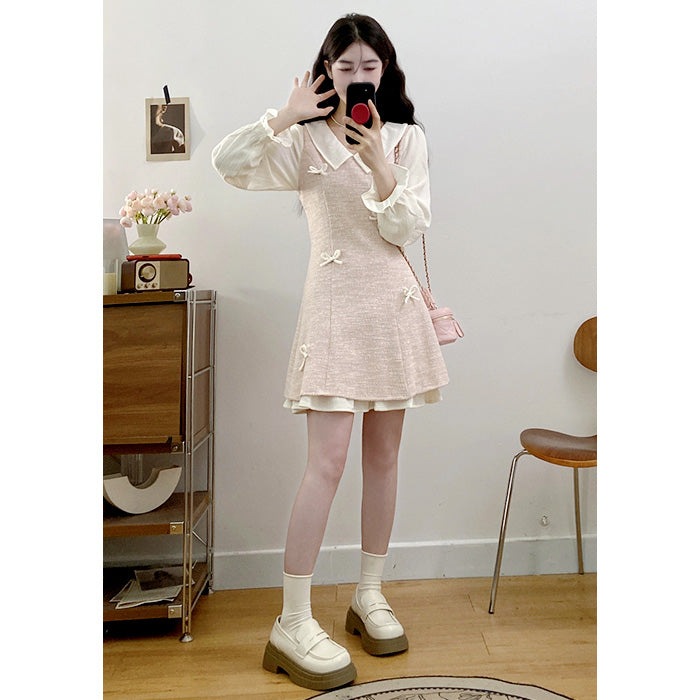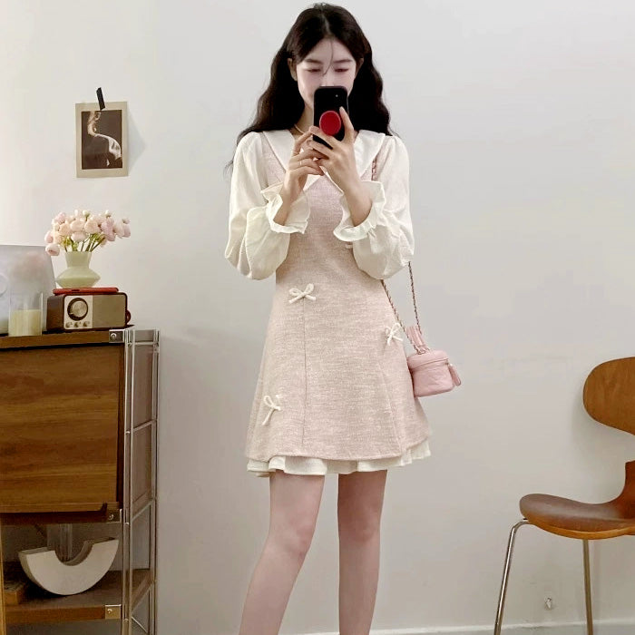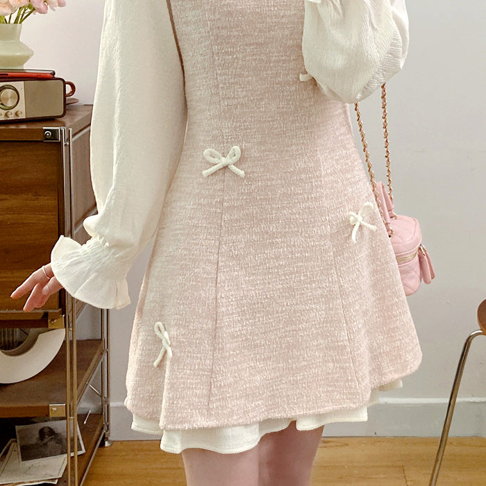 さらりとしたツイード風生地に、ふっくらとした長袖ブラウスをレイヤードしたようなデザイン。