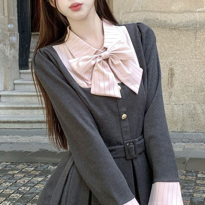 上品なグレーにピンクの差し色が映える、大きいサイズの秋冬ワンピース。