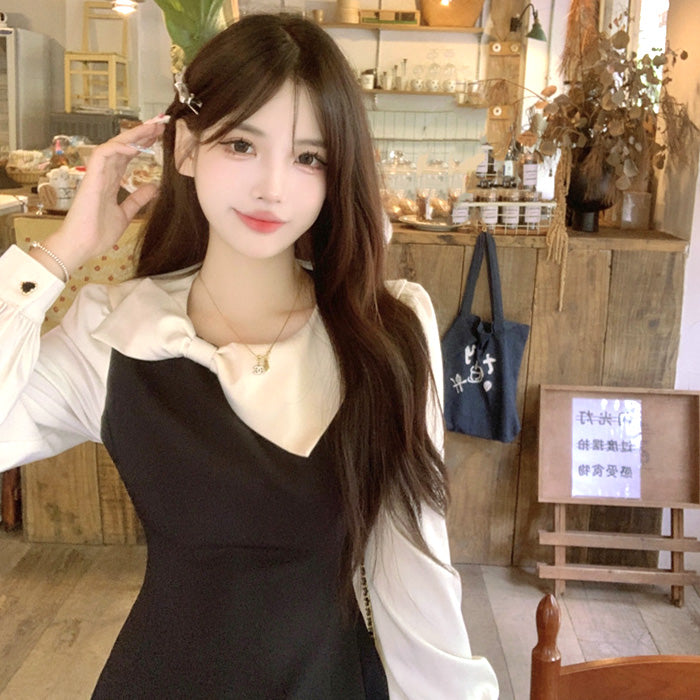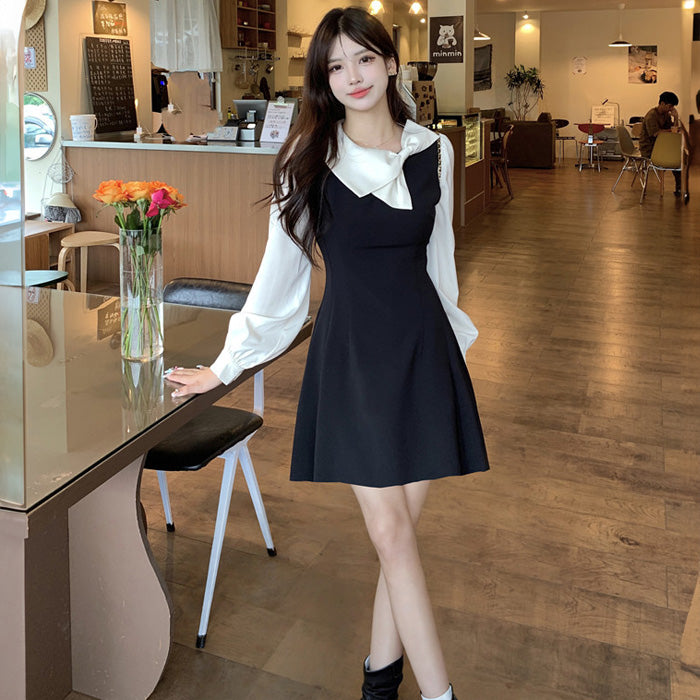 ボウタイ風の襟が顔まわりを明るく見せ、シンプルながらも華やかに。