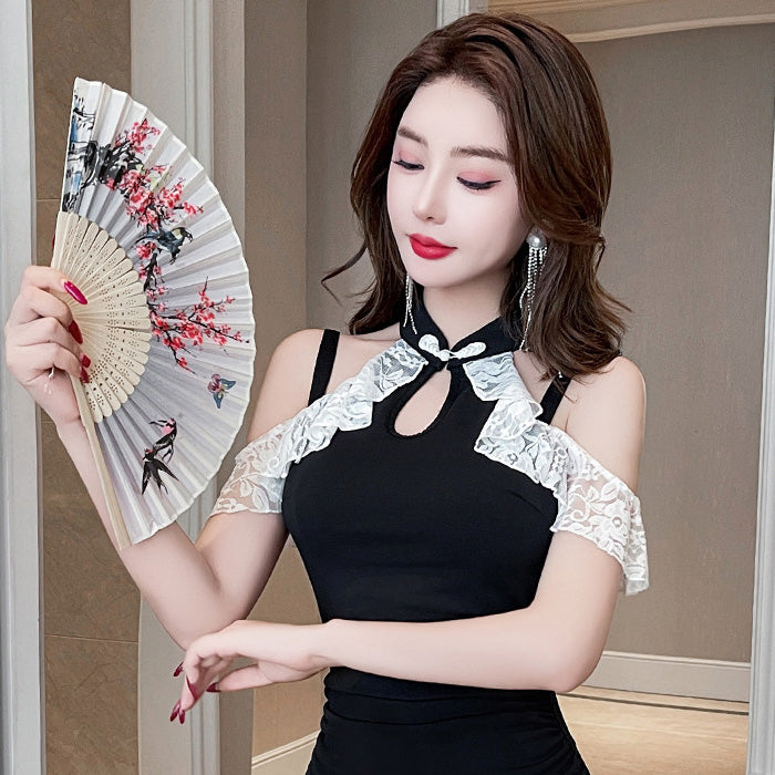 肩を美しく見せるオープンショルダーと、繊細な白レースのフリルが女性らしさを引き立てます。