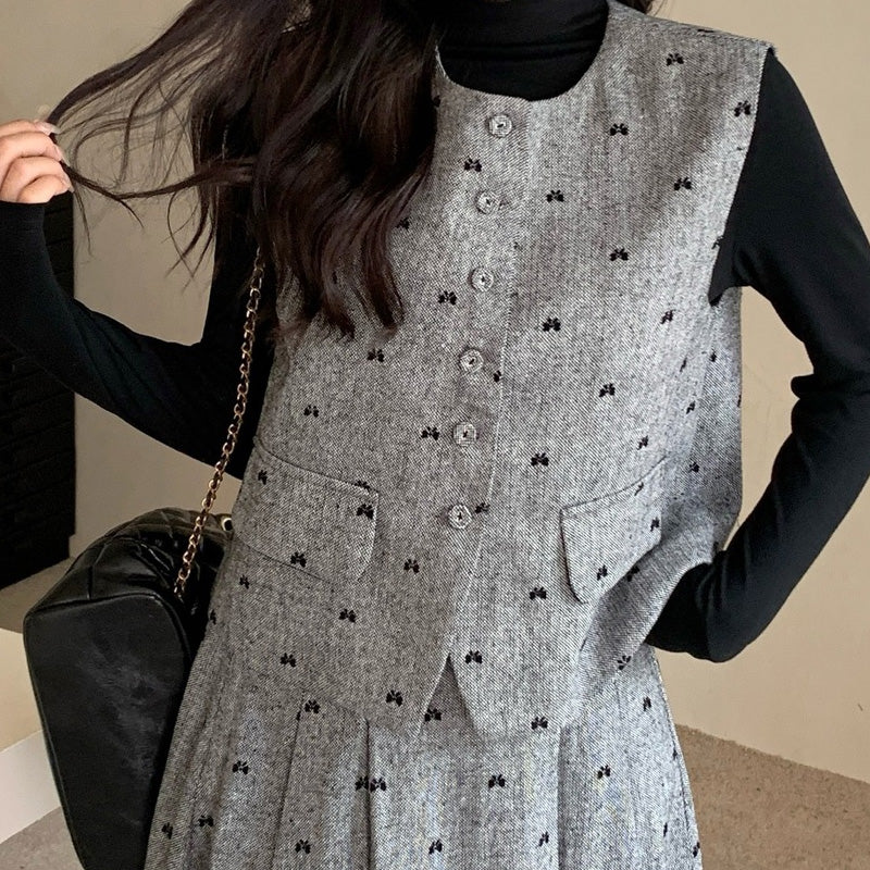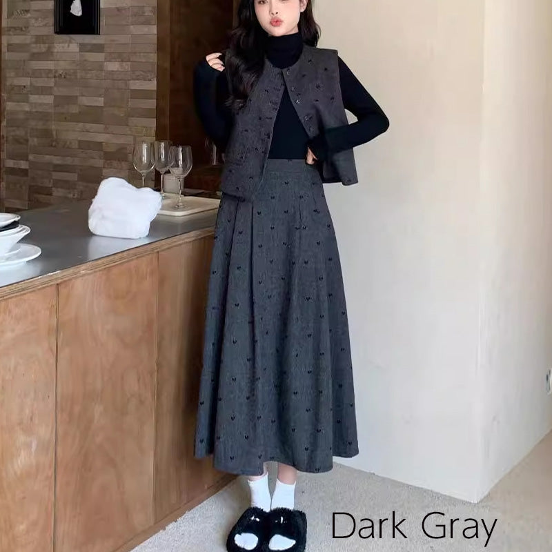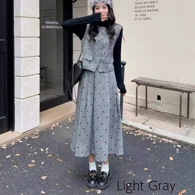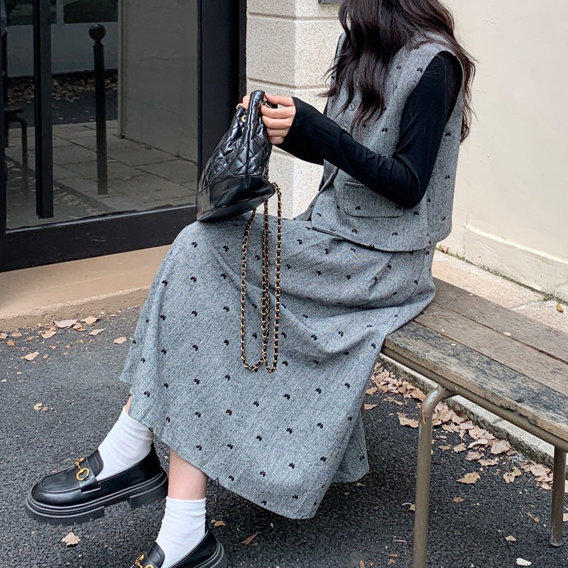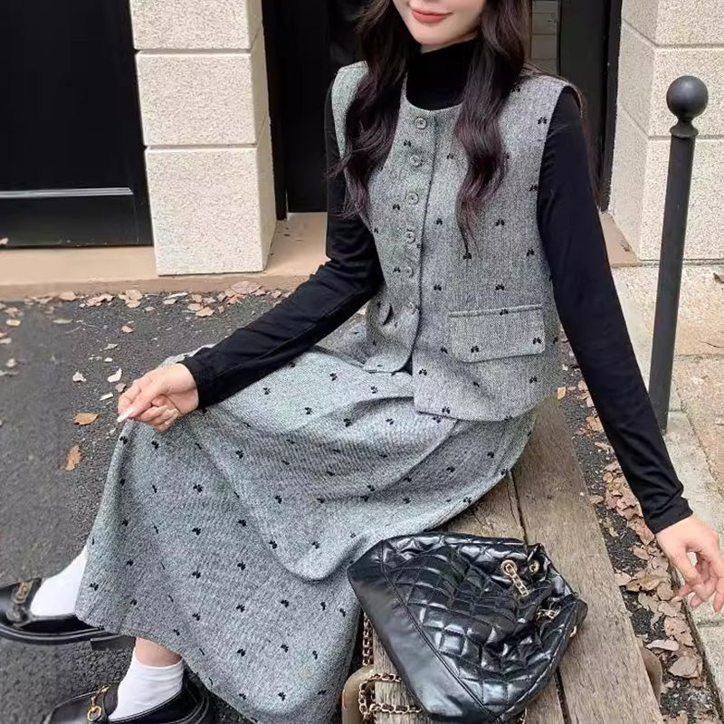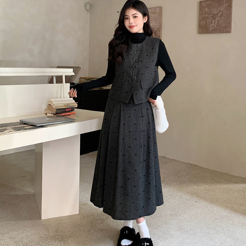 セット内容は、ベーシックな長袖インナー・クラシカルなボタンベスト・揺れるフレアロングスカートの3点。