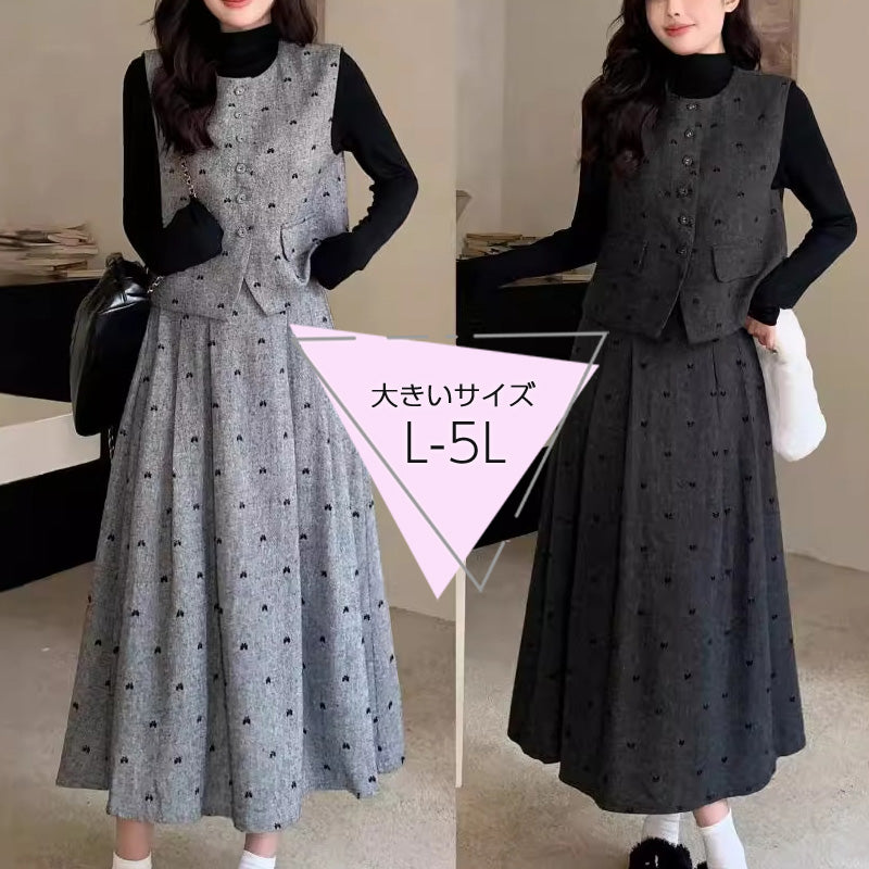 大きいサイズレディースグレーリボンドット・ツイード3点セットアップ(L/LL/3L/4L/5L)