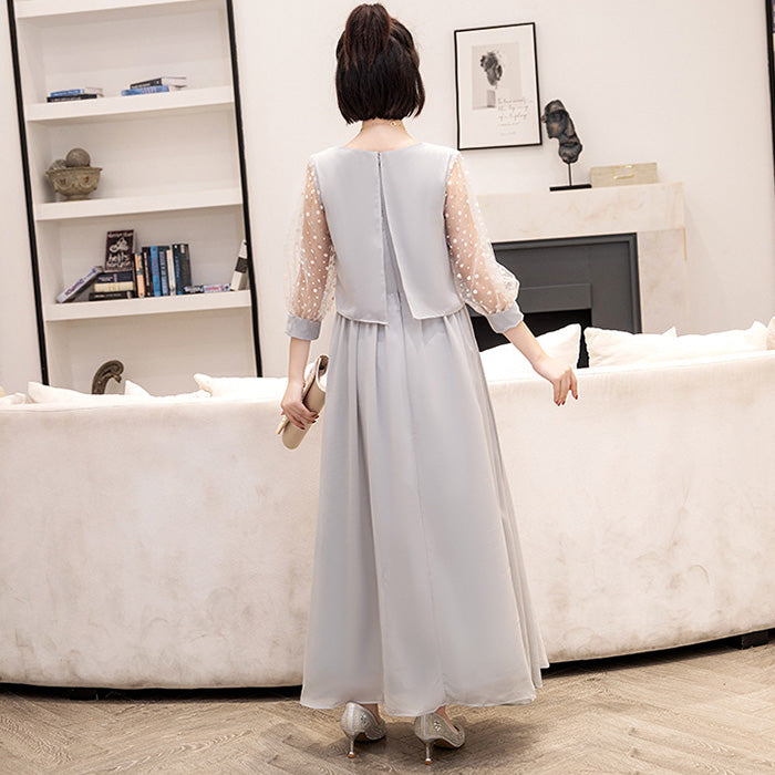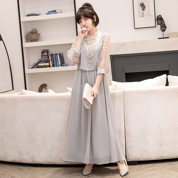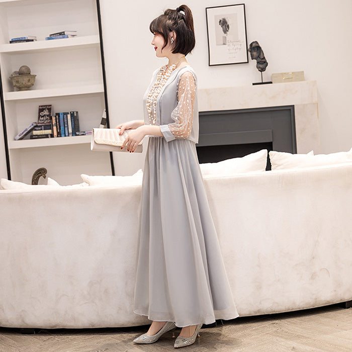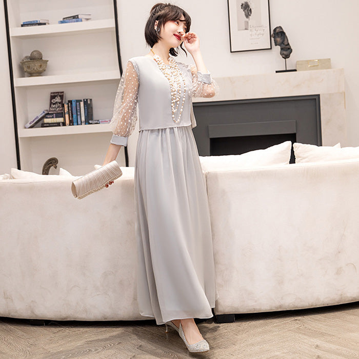 軽やかなシフォン素材が歩くたびにふわっと広がり、グレーの深みが秋冬の装いにぴったり。