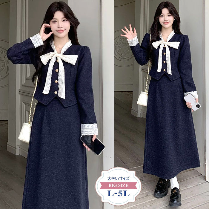 「大きいサイズでもかわいく上品に着たい」「プラスサイズだけど華やかな服がほしい」という方に心からおすすめできる一着。肌寒い季節を、気分ごとあたたかくしてくれる特別なツーピースセットです。