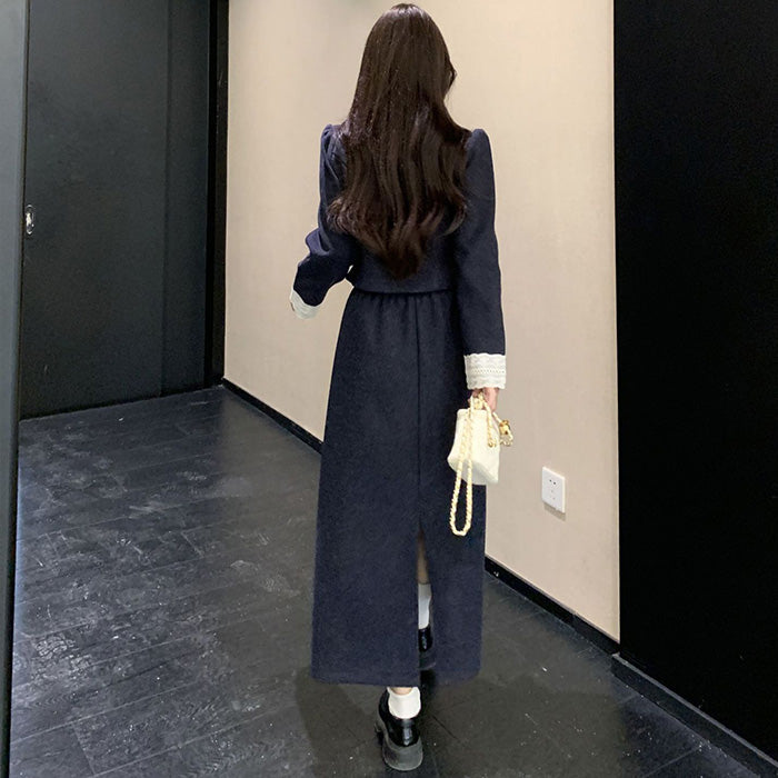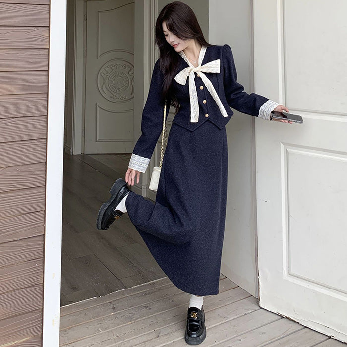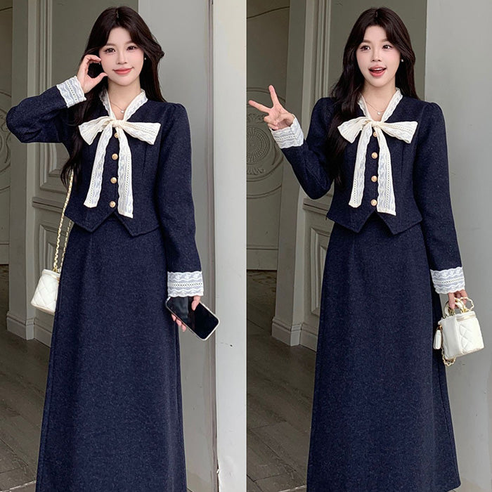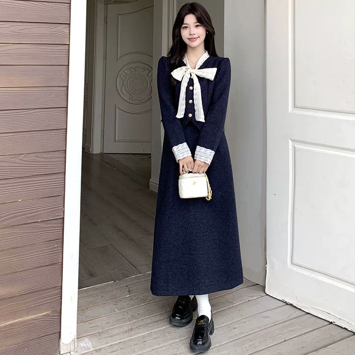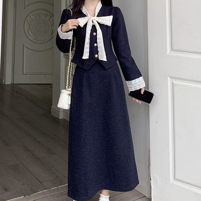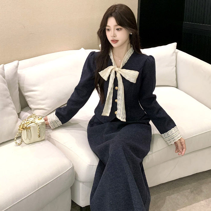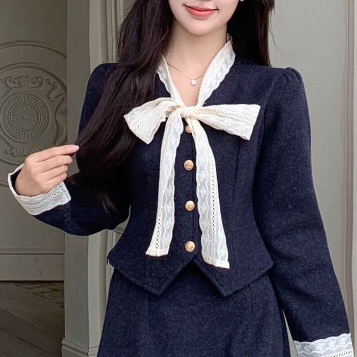 胸元の大きなリボンとゴールドボタンがポイントで、写真映えも抜群。お出かけや特別な日だけでなく、デートやお友だちとのランチなど、日常にもすっとなじむ上品デザインです。袖口のレースは手元を明るく見せてくれるので、秋冬の重たく見えがちなコーデに華やかさをプラスします。