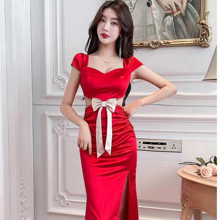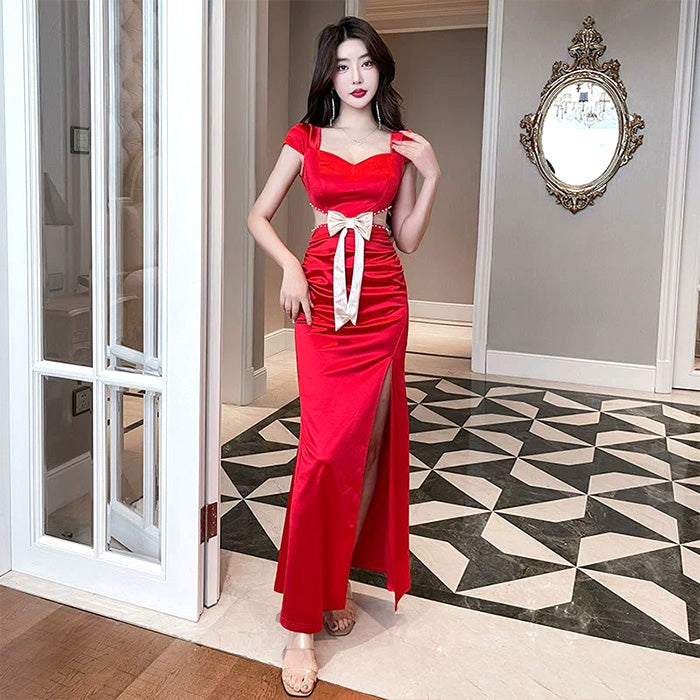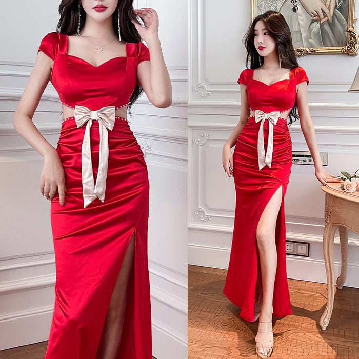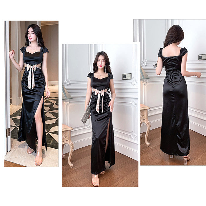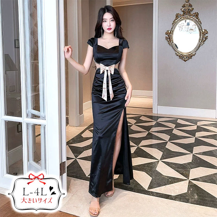 ウエストには華やかなリボンデザインをプラスし、視線が上に集まるから自然とスタイルアップ。左右のビジュー風ラインがさりげなくきらめき、特別な夜にぴったりの存在感です。スリット入りのロング丈は足元を長く見せてくれるので、ぽっちゃりさんでもすらっとした縦のラインを演出します。歩くたびサテンがゆるやかにゆれるシルエットは、秋冬の店内照明でもとても綺麗に見えます。