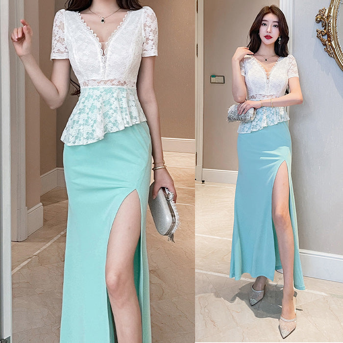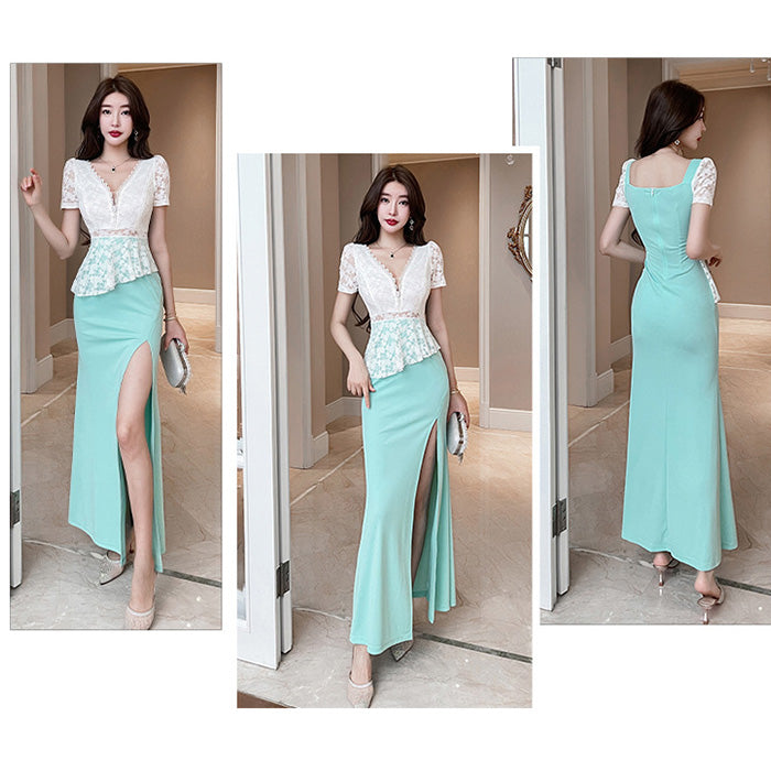 スカート部分はなめらかに落ちるロングシルエットで、動くたびに女性らしさが香る一枚。サイドの深めスリットが脚を長く見せ、キャバドレスらしい色気もきちんとプラス。ピーチとミントの2色は上品でやわらかく、華やかな場でも季節感と清潔感を演出してくれます。