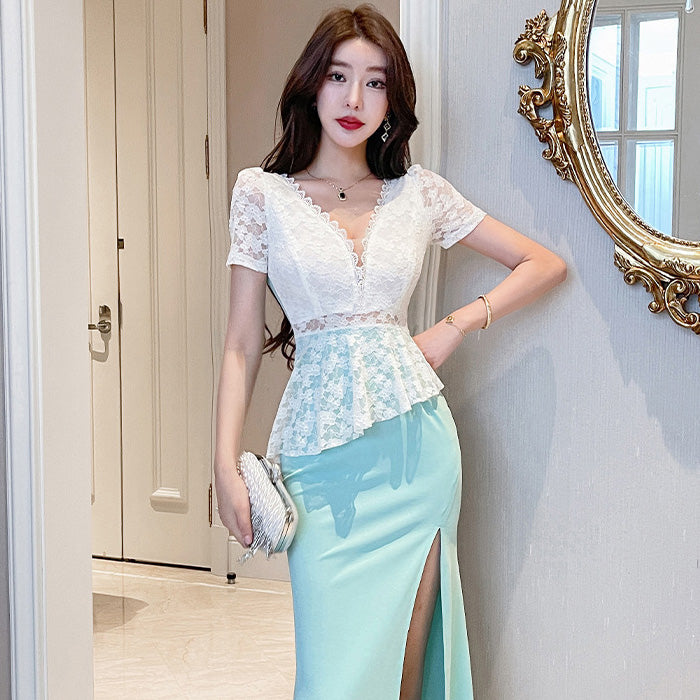 大きいサイズレディースシュガーフレール・レースペプラムスリットドレス(L/LL/3L/4L)