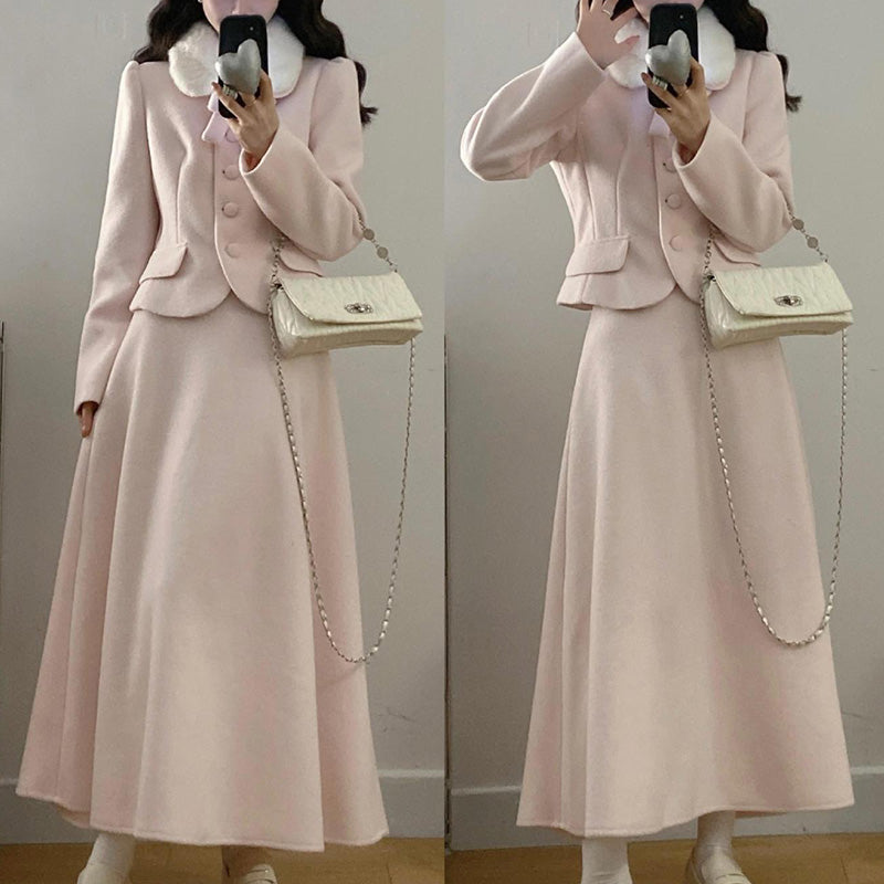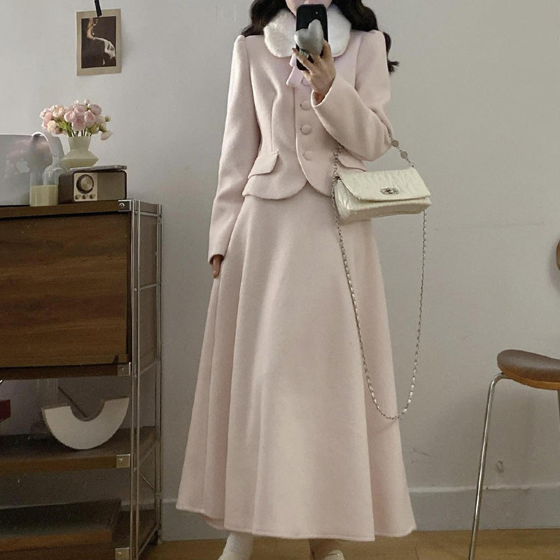 大きいサイズレディースシュガーミルク・ファーカラーフレアセットアップ(L/LL/3L/4L/5L)