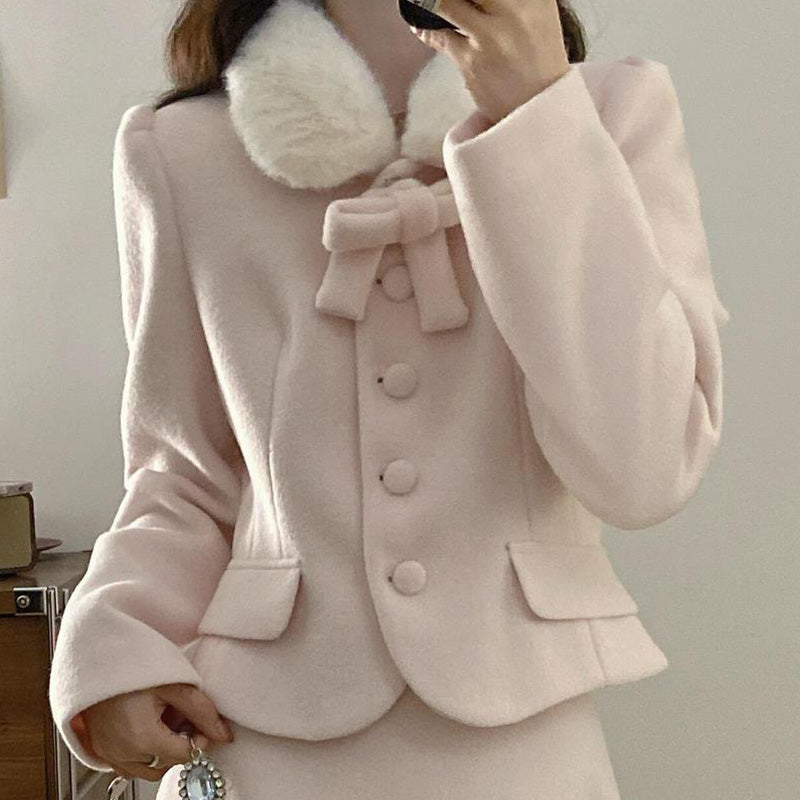 上品なファーカラーとリボンモチーフが、まるで映画のヒロインのようなフェミニンな雰囲気を演出します。