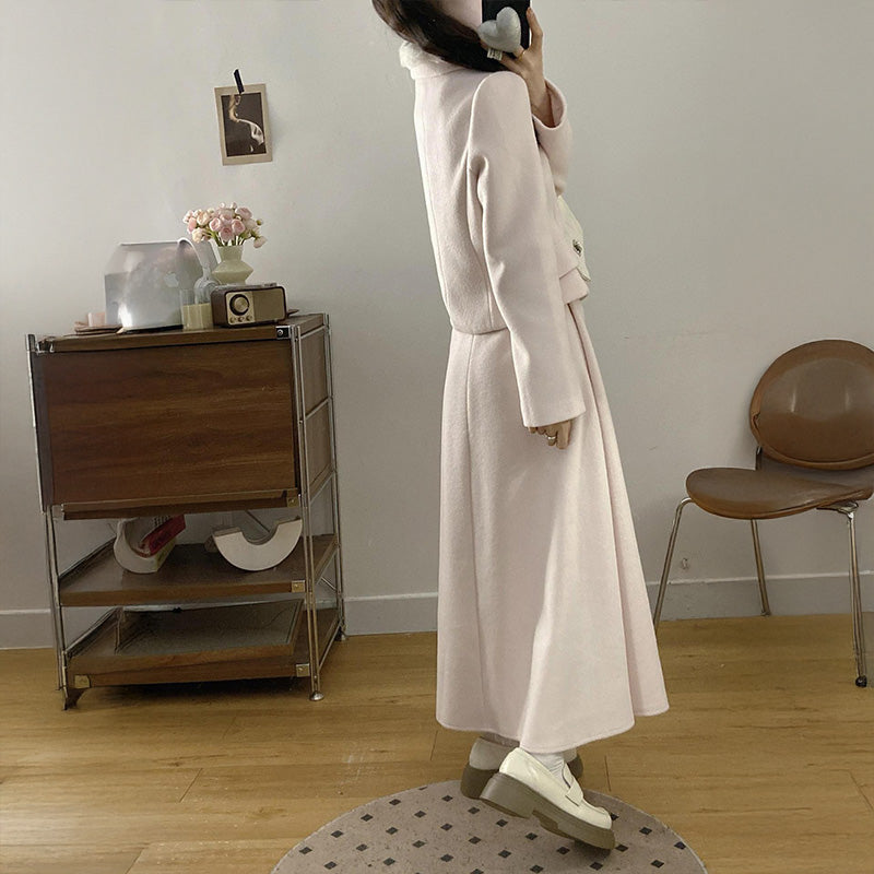 ウエストラインをすっきり見せるショート丈ジャケットと、動くたびに揺れるフレアスカートの組み合わせで、ぽっちゃりさんの体型もやさしくカバー。