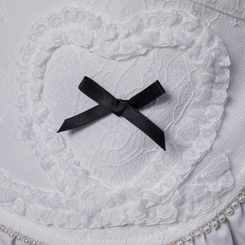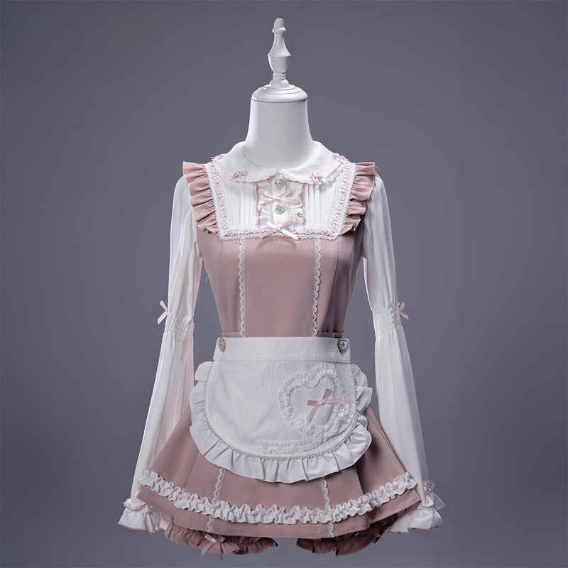 ふんわり広がるミニスカート風シルエットと、甘いハートエプロンが視線を奪うガーリースタイルです。