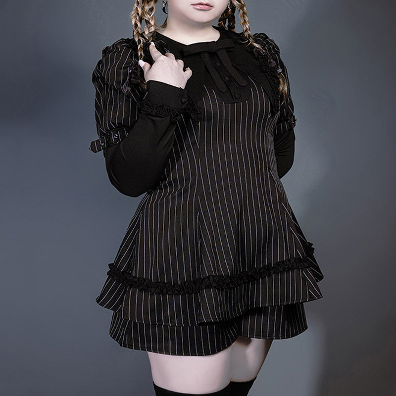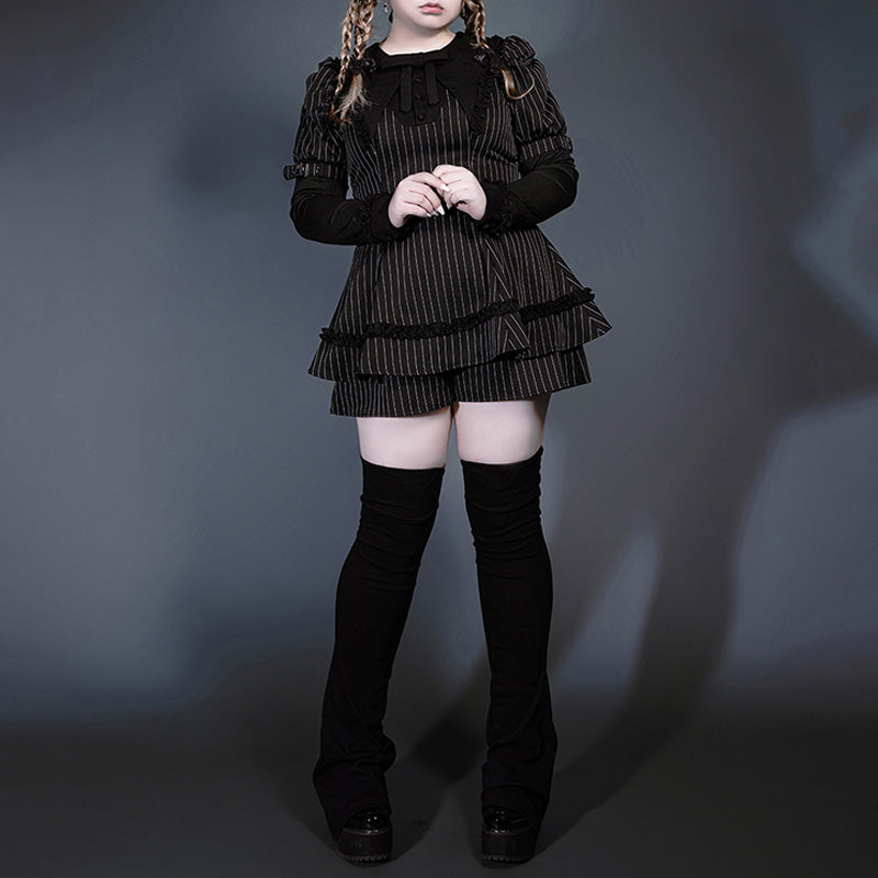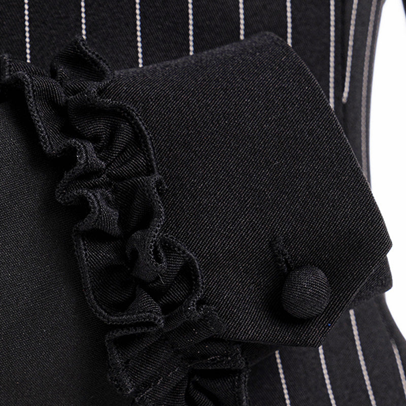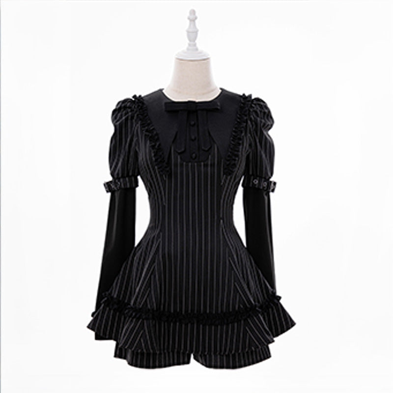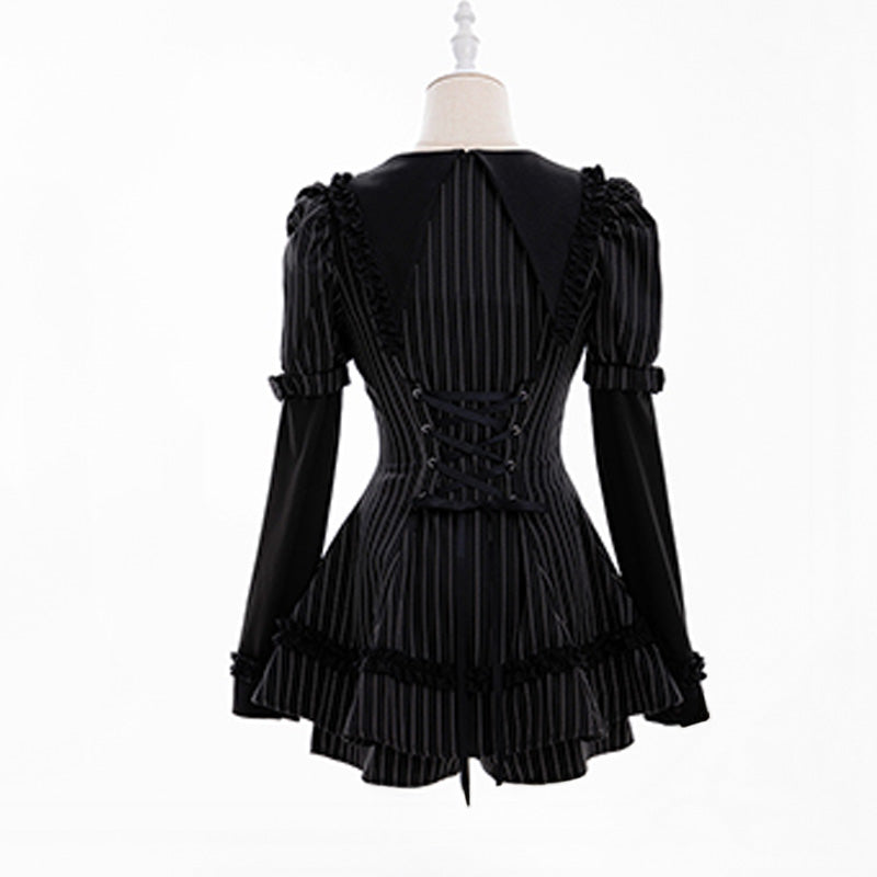 クラシカルなピンストライプ生地に、フリルとリボンを重ねた繊細なディテールが映える1着です。