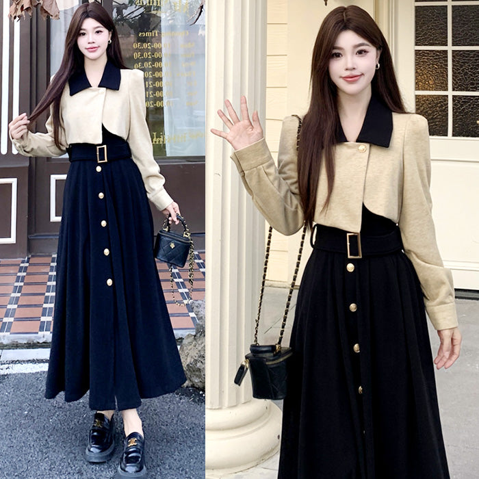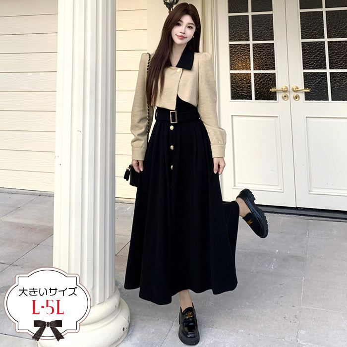 秋冬のおしゃれをぐっと上品に見せてくれる、大きいサイズ専用の2トーンワンピースが登場しました。シャンパンベージュとブラックのコントラストが美しく、ぽっちゃりさんがすっきり見える色合わせにこだわったプラスサイズ設計です。