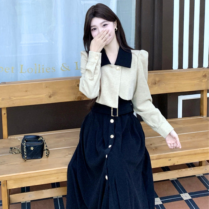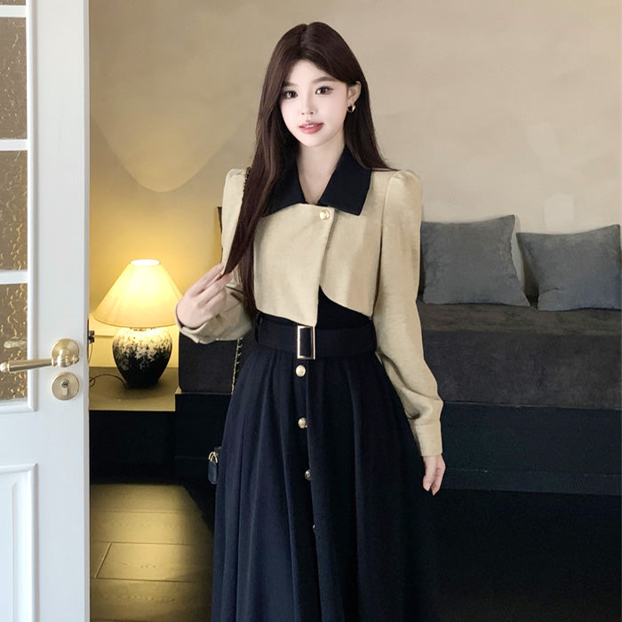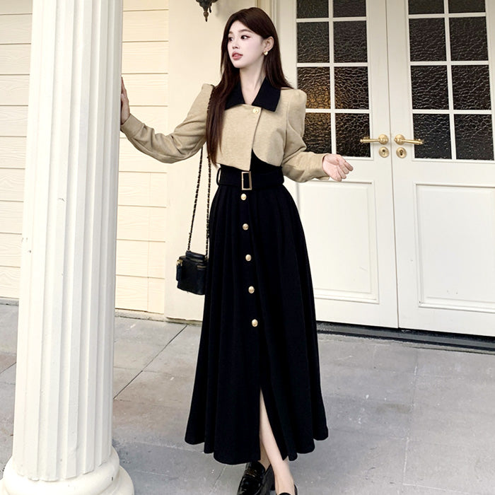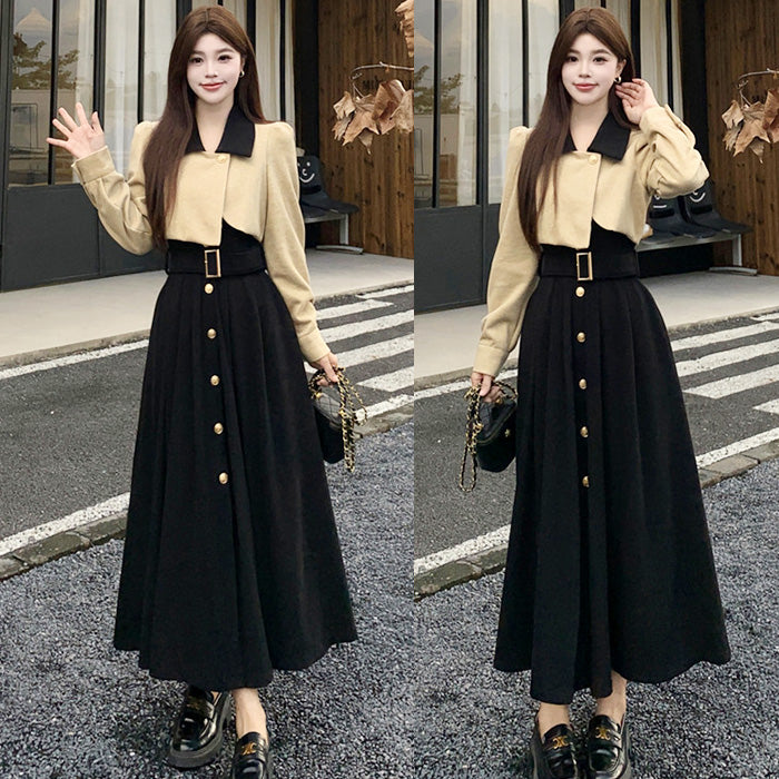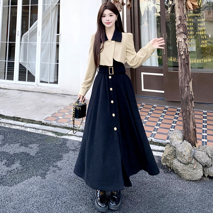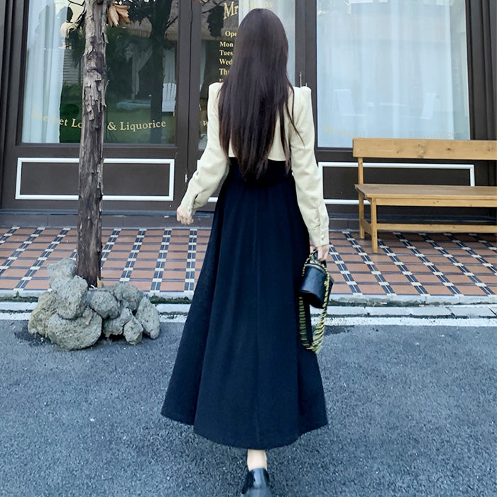 スカート部分は広がりすぎないフレアラインで、足元までストンと落ちる縦ラインを強調。歩くたびゆれるロング丈が上品で、秋冬のデートやお出かけにもぴったりです。ぽっちゃりさんの気になるお腹や腰まわりも自然に隠れるので、着るだけでスタイルアップが叶います。