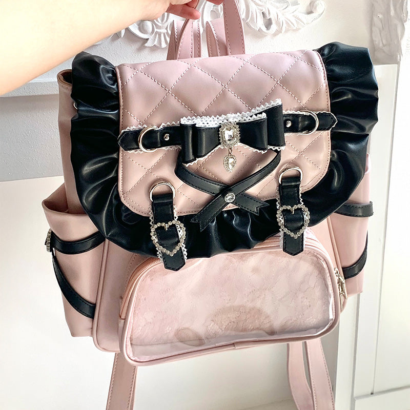 大きいサイズレディースブラック×ベビーピンクの地雷フリルリボンリュック・かばん