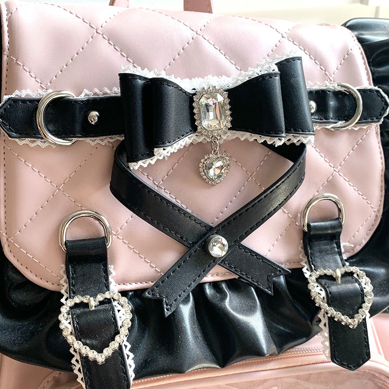 ふわっと広がるフリル、キルティング風の表面、ハートのビジュー金具、揺れるジュエリーチャームなど、細部まで「かわいい」を詰め込んだ高見えデザインがポイントです。ブラックとベビーピンクの組み合わせは、甘さと強さの両方を表現できて、地雷系ファッションとの相性も抜群。