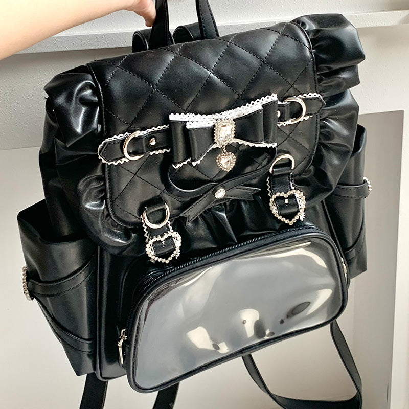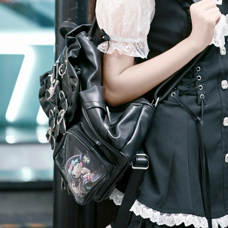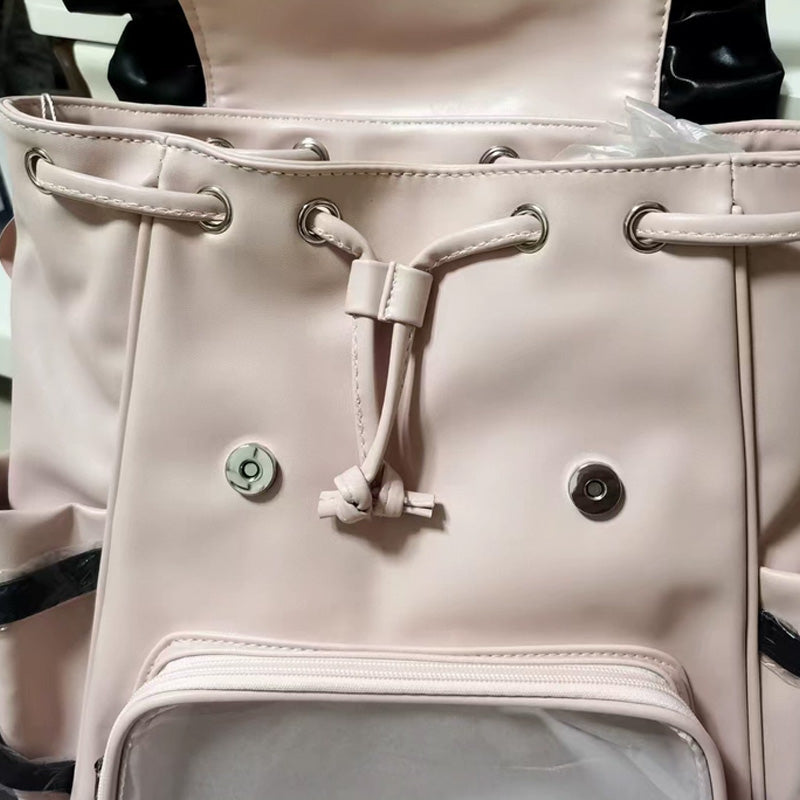 前面には透明ポケットがあり、ぬいぐるみやキーホルダーを入れて“痛バッグ風”にアレンジも可能。推し活にも使えるので、ライブ・イベント・カフェ巡りなど幅広いシーンで活躍します。