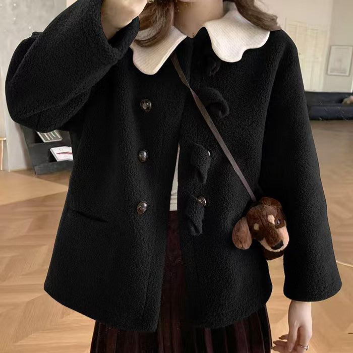 大きめの白襟デザインが顔まわりを明るく見せ、ブラックでも重たくなりすぎないのがポイント。