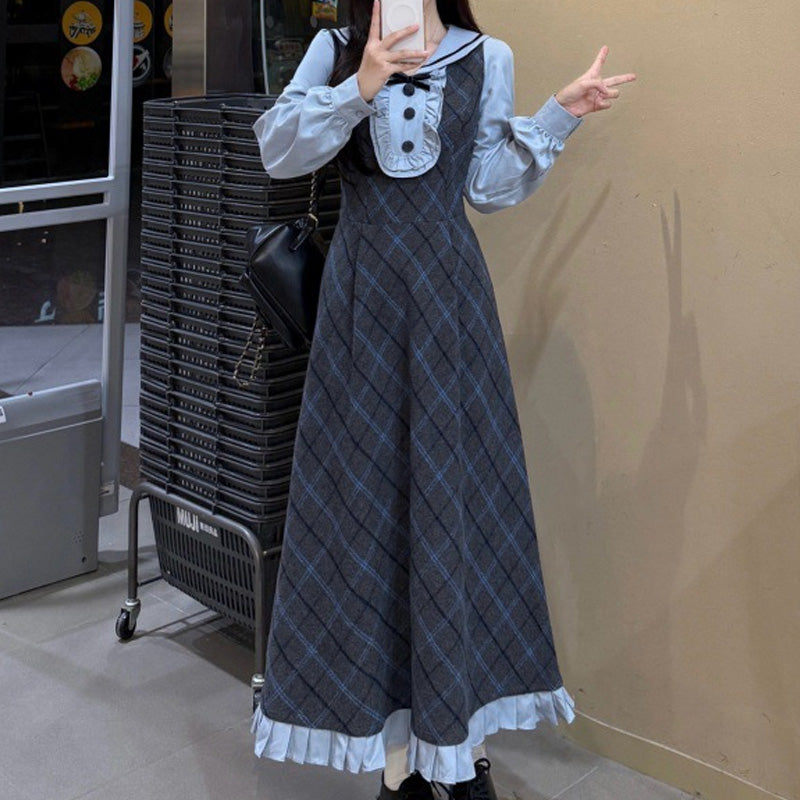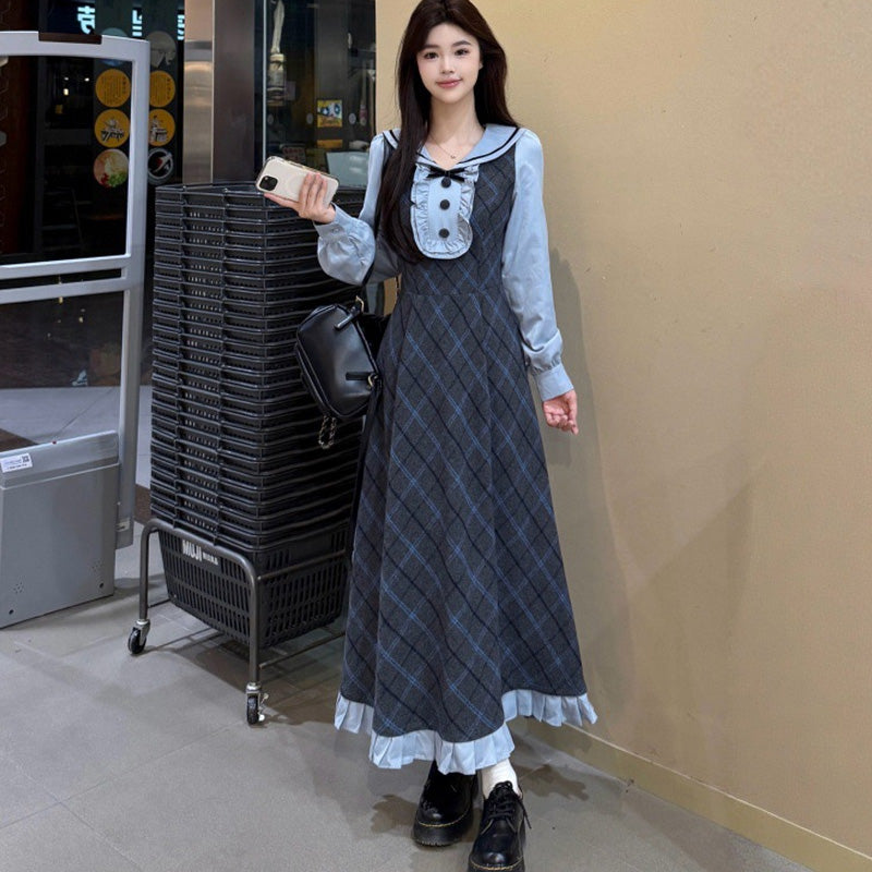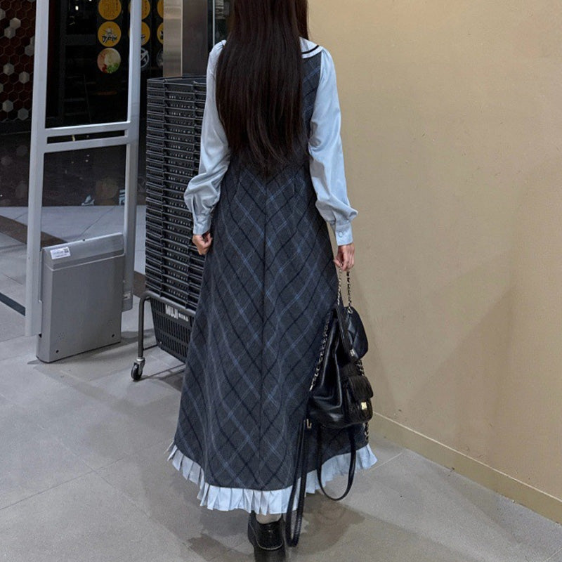大きいサイズレディースウィンターチェック・グレーブルーのフレアワンピース(L/LL/3L/4L/5L)