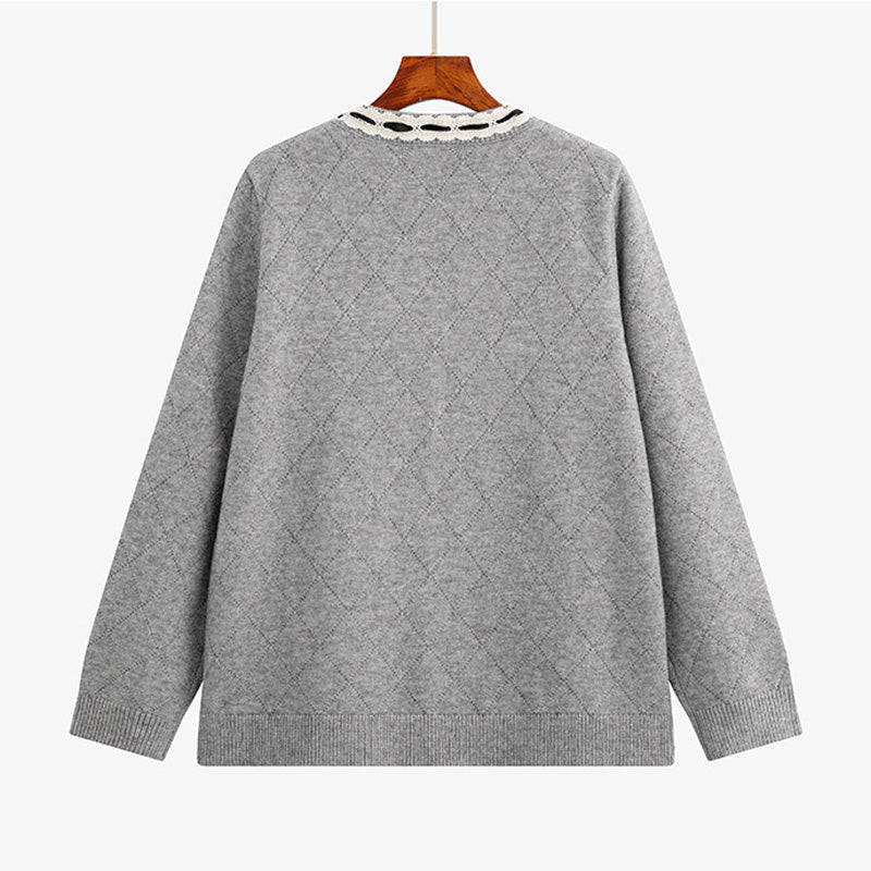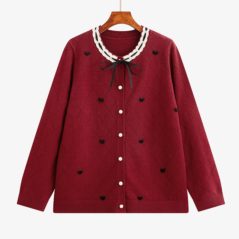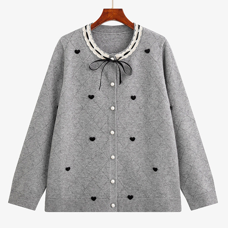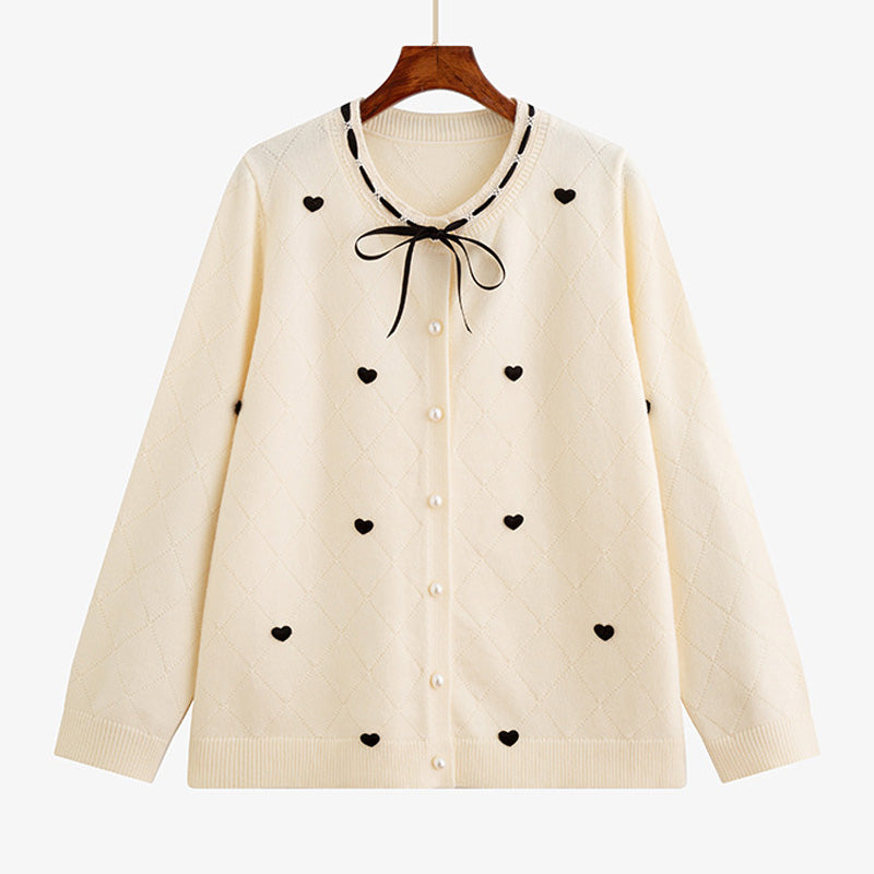さりげない可愛さを楽しみたい、大きいサイズさんのためのハート柄ニットカーディガン。