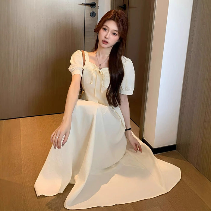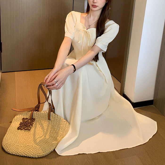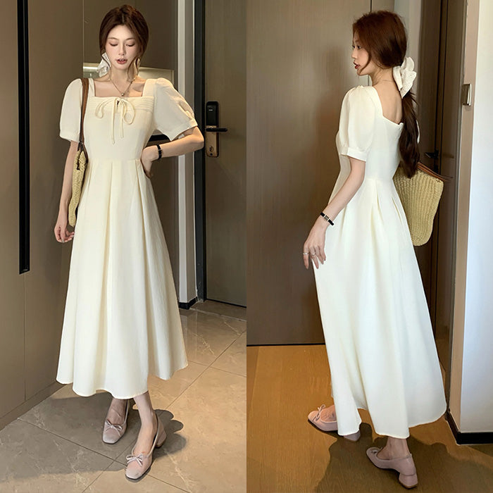 ふんわりとしたパフスリーブと広がるフレアシルエットが、大きいサイズでもバランスよく見えるラインを作ります。