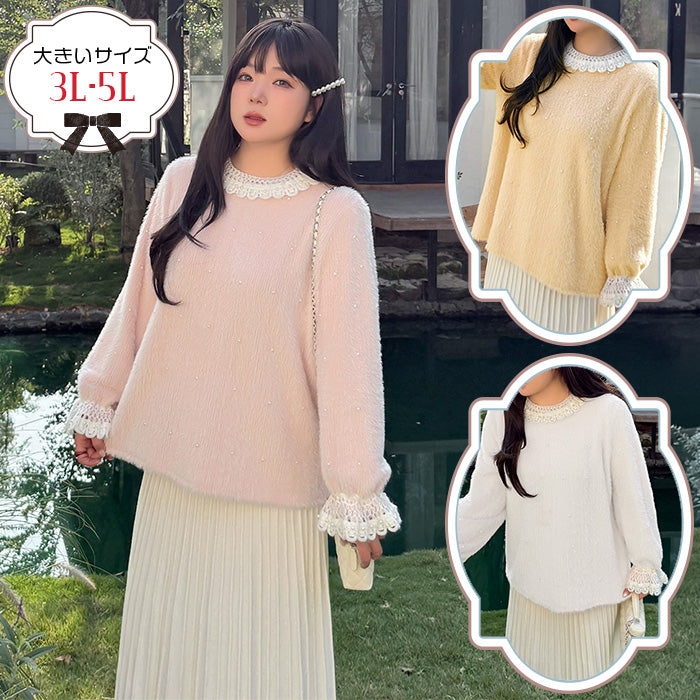 大きいサイズ レディース パールレースカラー・ふわもこガーリーニット(3L/4L/5L)