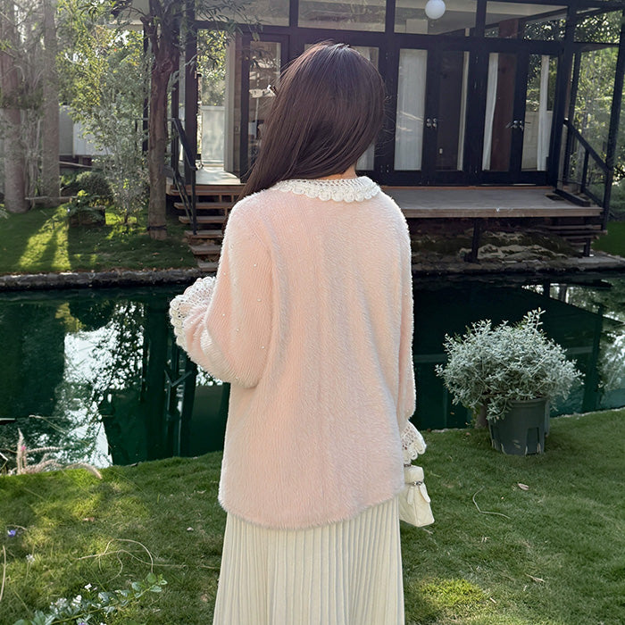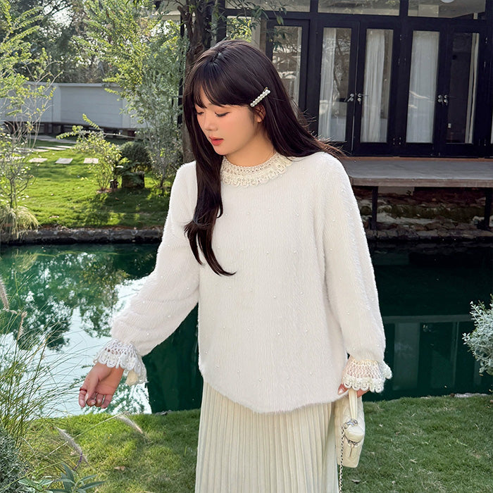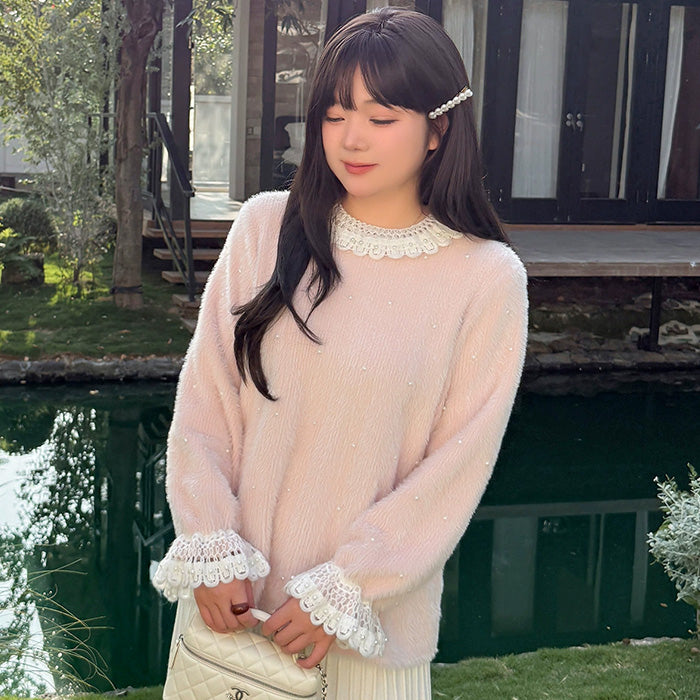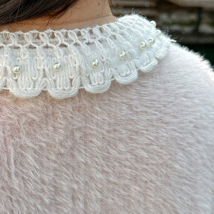 ふんわり柔らかな質感とレース襟が可愛い、ガーリーなニットトップス。