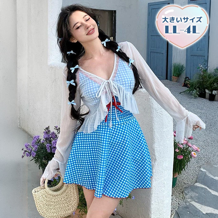 大きいサイズ レディース サマーチェック・リボンガーリースイムワンピ(LL/3L/4L)
