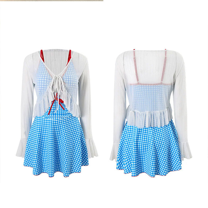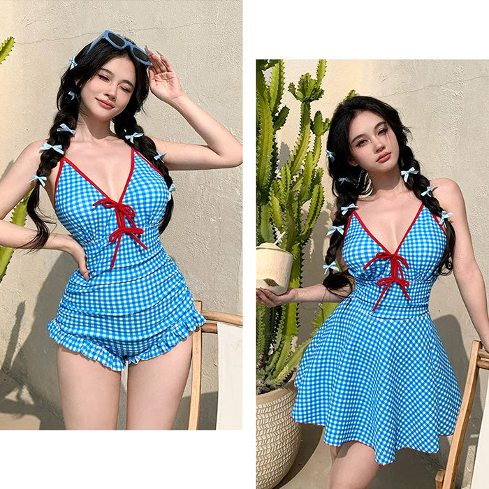 爽やかなブルーのギンガムチェックと赤リボンが目を引く、ガーリーなスイムワンピース。