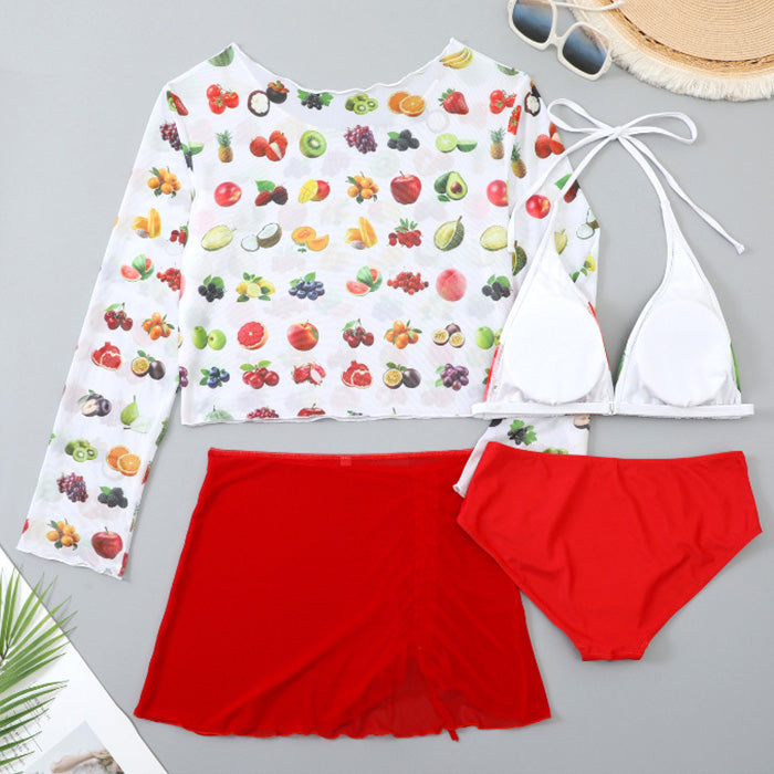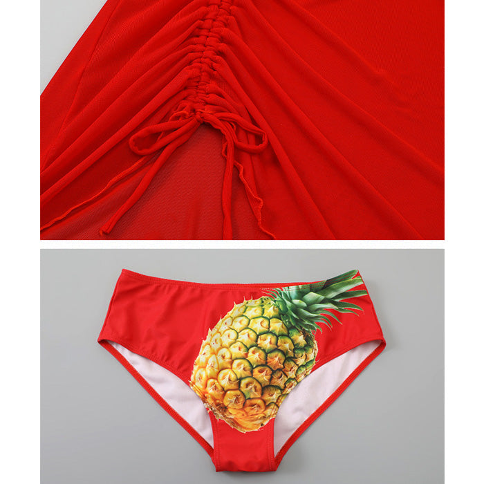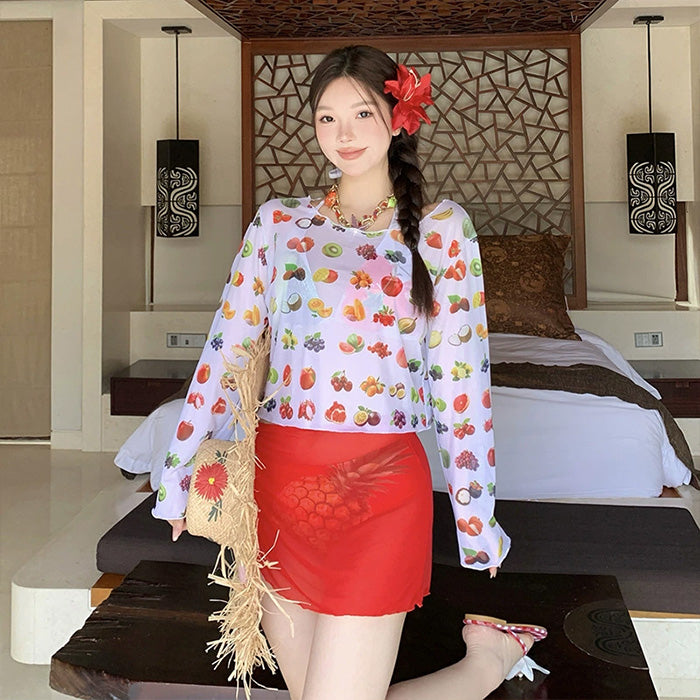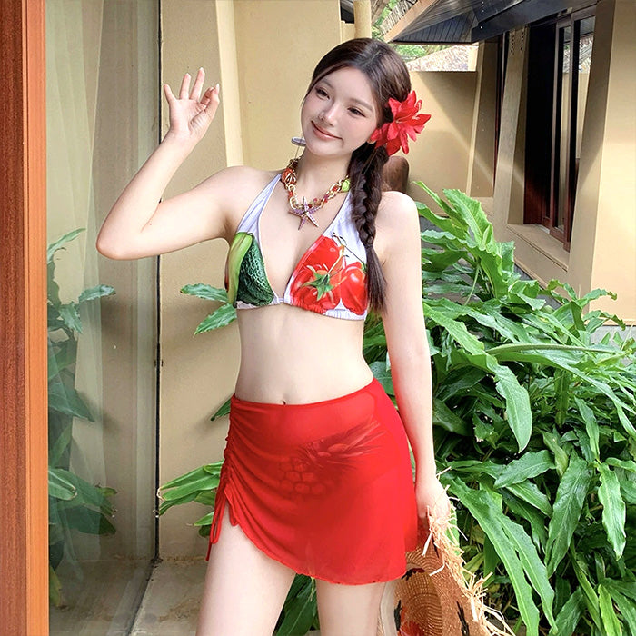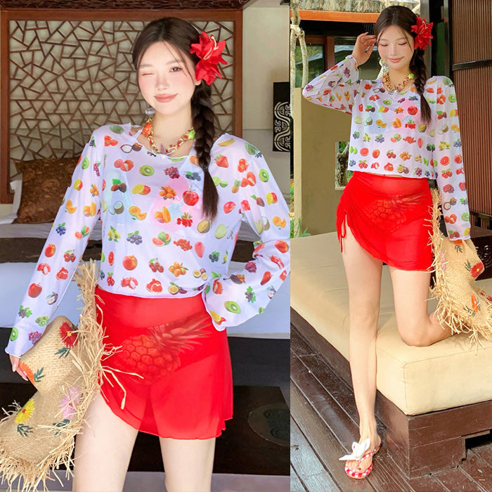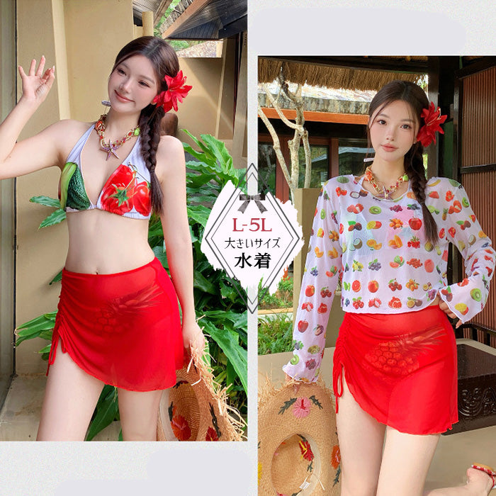 中はフルーツデザインのビキニと、赤のショーツ+スカート付き。ウエストはゴム仕様で履きやすく、プラスサイズの方でも締め付けにくく快適な着心地です。動きやすいのでプールや海でも安心して楽しめます。