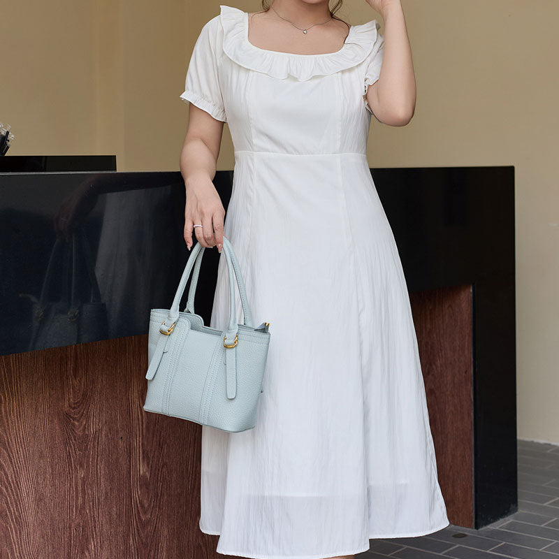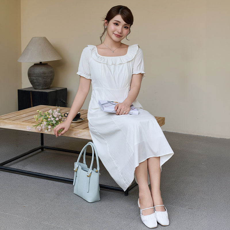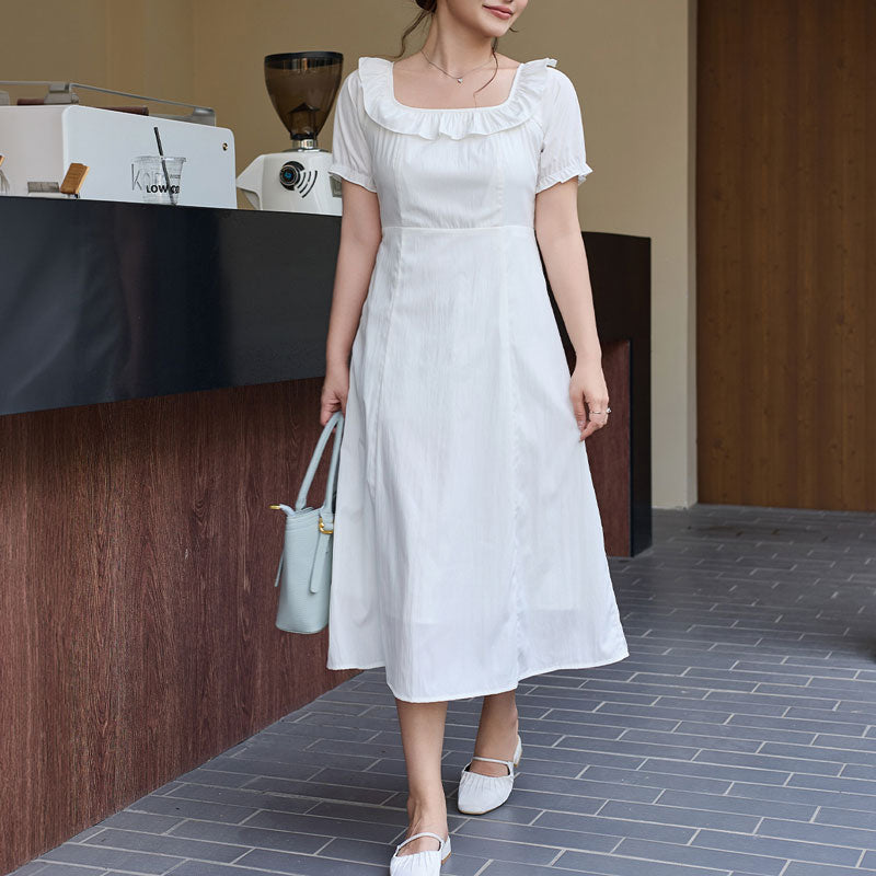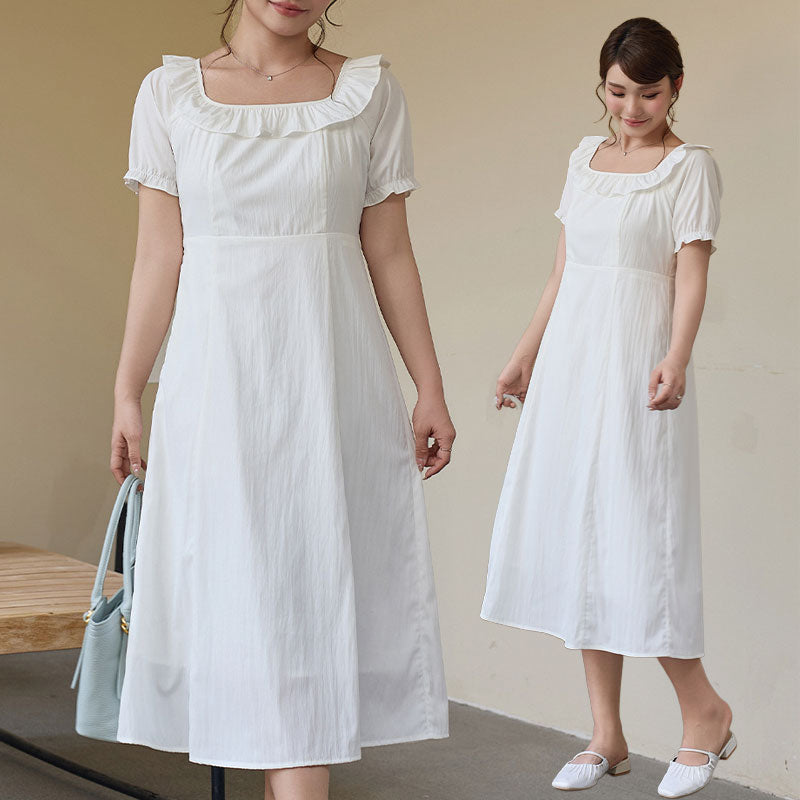 大きいサイズ レディース やわらか純白のフリルネック上品ワンピース(LL/3L/4L/5L/6L)