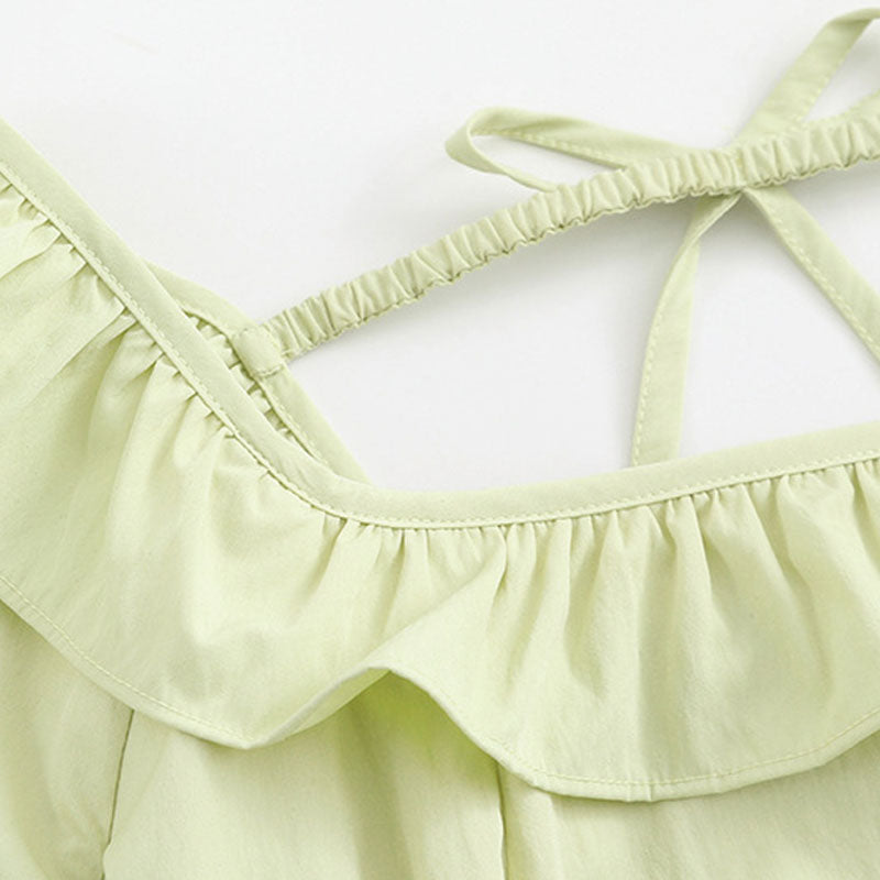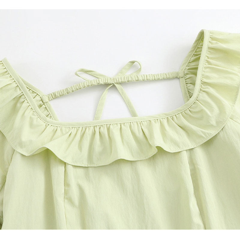 やわらかなホワイトカラーに、首元のフリルデザインがほんのり甘さをプラス。大きいサイズでもすっきり見えるシルエットで、ぽっちゃりさんの体型を自然にカバーしてくれます。